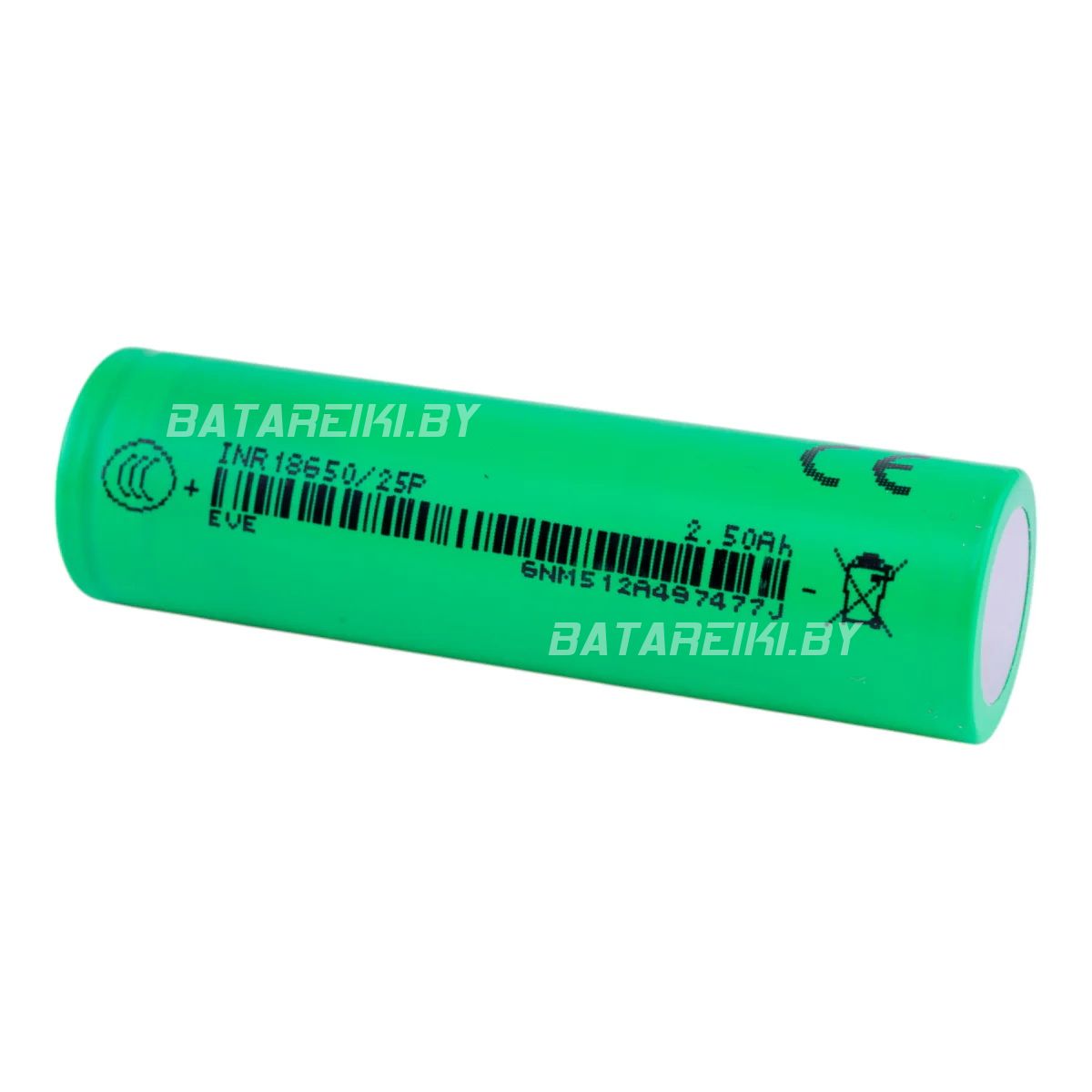 EVE 18650-25P 2500mAh - высокотоковый литий-ионный аккумулятор без встроенной защиты, используется для ремонта и восстановления аккумуляторных сборок в электроинструменте, электровелосипедах, электрошокерах, пылесосах. А также применяется как источник питания в парогенераторах, тактических фонарях, портативных зарядных устройствах (PowerBank) и др.