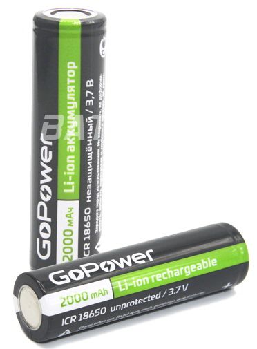 GoPower 18650 2000mAh - литий-ионный аккумулятор без встроенной защиты, используется для ремонта и восстановления аккумуляторных сборок в медицинском оборудовании, ноутбуках, игрушках и моделях, радиостанциях, фонарях, электровелосипедах, пылесосах. А также применяется как источник питания в тактических фонарях, портативных зарядных устройствах (PowerBank) и др.