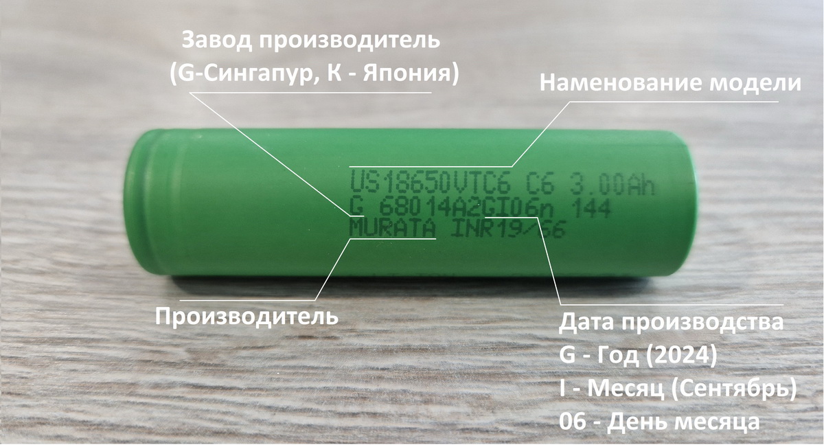 Аккумулятор Murata VTC6 на фотографии выше выпущен 06 сентября 2024 года. G - 2024 год, I - сентябрь месяц, 06 - день месяца.