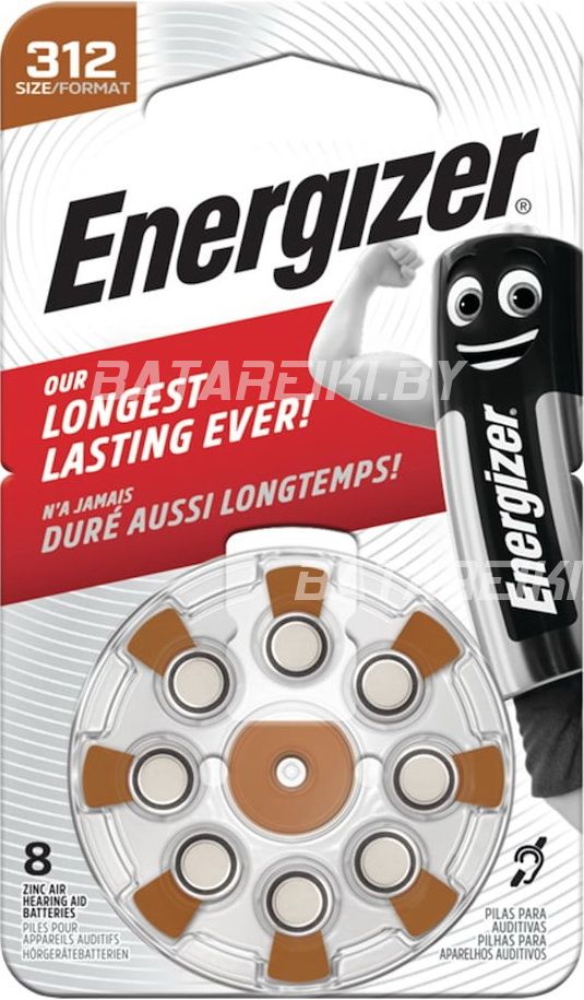 Energizer 312 - специально разработаны для надежной работы в чувствительных слуховых аппаратах. Обладают большой емкостью, не содержат токсичных веществ, имеют длительный срок хранения, поскольку конструкция элемента предусматривает специальную наклейку-ярлычок, исключающую доступ воздуха до момента эксплуатации.